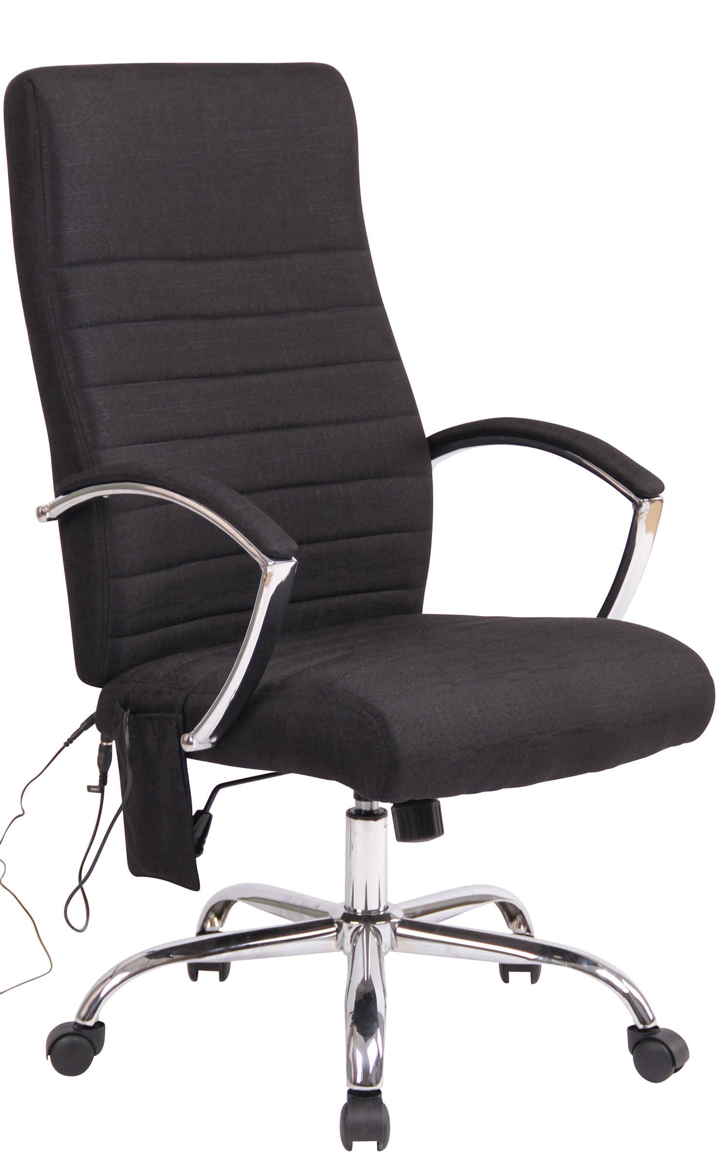 Bürostuhl Valais Dieser Chefsessel Valais überzeugt nicht nur mit seinem edlen Look, auch in Sachen Komfort und Belastbarkeit kann ihm keiner etwas vormachen. Seine gute Polsterung und der pflegeleichte Bezug mit stilvollen Ziernähten sorgen dabei für ein angenehmes Sitzgefühl, auch bei längerer Verweildauer. Dank der stufenlos verstellbaren Sitzhöhe garantiert der Schreibtischstuhl jederzeit ein ergonomisches Sitzen. Zudem sorgt der eingebaute Wippmechanismus für mehr Bewegungsfreiheit. Dabei steht er standsicher auf fünf Leichtlaufrollen und einem Gestell aus Metall in Chromoptik. Zusätzlich verfügt der Valais über eine Massagefunktion die über eine Kabelfernbedienung gesteuert wird, auswählbar sind folgende Funktionen: - Intensität = 2 Stufen - Vibrationsfunktion - Modus = 5 Varianten (Pulse, Press, Wave, Auto, Normal) - Massage Punkte = Insgesamt 7 (1 Nacken, 2 Rücken, 2 Lendenwirbel und 2 Oberschenkel) - Timer = 3 Varianten (15min, 30min, 60min) - Kabellänge = 188 cm, EU Stecker mit 230 V Materialzusammensetzung: 100% Polyurethan / 100% Polyester Ca. Maße: Gesamthöhe: 113 - 123 cm Gesamtbreite: 58 cm Gesamttiefe: 72 cm Sitzhöhe: 53 - 63 cm Sitzfläche (BxT): 52 x 50 cm Höhe Rückenlehne: 70 cm Höhe Armlehne: 19 cm Max. Belastbarkeit: 136 kg Gewicht: 19 kg Sitz: Bezug: Stoff (100% Polyester) Bezug: Kunstleder (100% Polyurethan) Sitz, Arm- und Rückenlehne bequem gepolstert Hohe Rücklehne für besseren Sitzkomfort Gestell: Material: Metall in Chromoptik Höhenverstellbar und Drehbar inklusive 5 Leichtlaufrollen Besonderheiten: Massagefunktion mit verschiedenen Einstellmöglichkeiten Wippfunktion für mehr Bewegungsfreiheit Dickes Polster für besseren Sitzkomfort Pflegehinweise: Zur Reinigung empfehlen wir ein mit lauwarmem Wasser angefeuchtetes Baumwolltuch Keine Haushaltsreiniger verwenden Oberflächen nur mit geeignetem Aufsatz absaugen