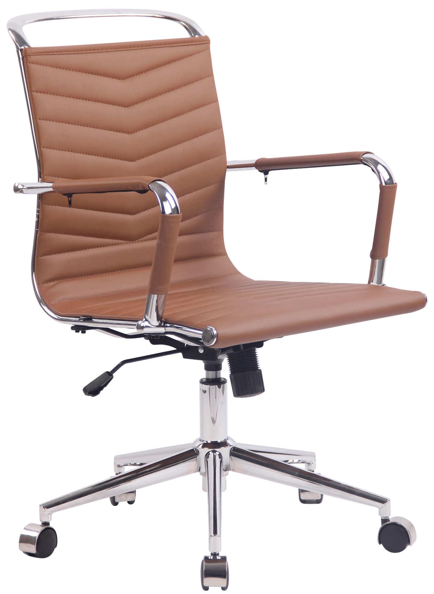 Bürostuhl Burnley - Klassisch, schlicht und komfortabel! Dieser Bürostuhl Burnley überzeugt nicht nur mit seinem modernen Look, auch in Sachen Komfort kann ihm keiner etwas vormachen. Der Drehstuhl ist wahlweise mit einem Kunstleder-, oder Echtlederbezug versehen und besonders pflegeleicht. Zudem ist die Sitzhöhe stufenlos verstellbar und garantiert ein ergonomisches Sitzen. Des Weiteren ist der Schreibtischstuhl mit einem Wippmechanismus versehen, der für mehr Bewegungsfreiheit sorgt. Die Stabilität ist durch das Metallgestell in Chromoptik gewährleistet. Durch die fünf Leichtlaufrollen kann man leicht und locker über den Boden rollen - egal ob auf Hart- oder Teppichböden. Das elegante Chromgestell und die stabil geschwungenen Armlehnen geben dem Ganzen noch das gewisse Extra und runden das Design ab. Materialzusammensetzung: 100% Polyurethan / Echtleder Ca. Maße: Gesamthöhe: 92 - 102 cm Gesamtbreite: 56 cm Gesamttiefe: 64 cm Sitzhöhe: 44 - 54 cm Sitzfläche (BxT): 51 x 44 cm Höhe Rückenlehne: 50 cm Höhe Armlehne: 68 - 78 cm Max. Belastbarkeit: 136 kg Gewicht: 11 kg Sitz: Bezug: Kunstleder Bezug: Echtleder Hohe Sitzqualität Angenehme Sitzposition durch Rückenlehne Gestell: Material: Metall in Chromoptik Höhenverstellbar und drehbar Inklusive 5 Leichtlaufrollen Besonderheiten: Eingebauter Wippmechanismus Lange Lebensdauer Modernes Design Pflegehinweise: Keine Haushaltsreiniger verwenden Leichte Verschmutzung mit feuchtem Baumwolltuch abwischen Oberflächen nur mit geeignetem Aufsatz absaugen