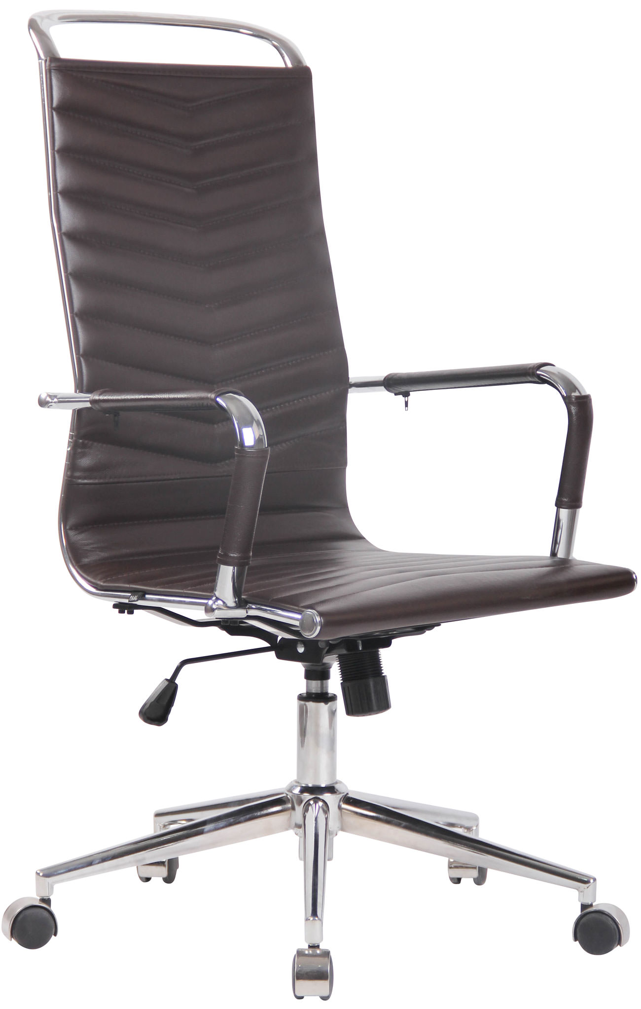 Bürostuhl Batley - Klassisch, schlicht und komfortabel! Dieser Bürostuhl Batley überzeugt nicht nur mit seinem modernen Look, auch in Sachen Komfort kann ihm keiner etwas vormachen. Der Drehstuhl ist wahlweise mit einem Kunstleder-, oder Echtlederbezug versehen und besonders pflegeleicht. Des Weiteren ist die Sitzhöhe stufenlos verstellbar und garantiert ein ergonomisches Sitzen. Zudem ist der Schreibtischstuhl mit einem Wippmechanismus versehen, der für mehr Bewegungsfreiheit sorgt. Die Stabilität ist durch das Metallgestell in Chromoptik gewährleistet. Durch die fünf Leichtlaufrollen kann man leicht und locker über den Boden rollen - egal ob auf Hart- oder Teppichböden. Das elegante Chromgestell und die stabil geschwungenen Armlehnen geben dem Ganzen noch das gewisse Extra und runden das Design ab. Ca. Maße: Gesamthöhe: 110 - 120 cm Gesamtbreite: 57 cm Gesamttiefe: 65 cm Sitzhöhe: 45 - 55 cm Sitzfläche (BxT): 51 x 45 cm Höhe Rückenlehne: 66 cm Höhe Armlehne: 23 cm Max. Belastbarkeit: 136 kg Gewicht: 12 kg Sitz: Bezug: Echtleder Bezug: Kunstleder (100% Polyurethan) Angenehme Sitzposition durch Rückenlehne Gestell: Material: Metall in Chromoptik Höhenverstellbar und drehbar Inklusive 5 Leichtlaufrollen Besonderheiten: Eingebauter Wippmechanismus Lange Lebensdauer Modernes Design Pflegehinweise: Keine Haushaltsreiniger verwenden Leichte Verschmutzung mit feuchtem Baumwolltuch abwischen Oberflächen nur mit geeignetem Aufsatz absaugen