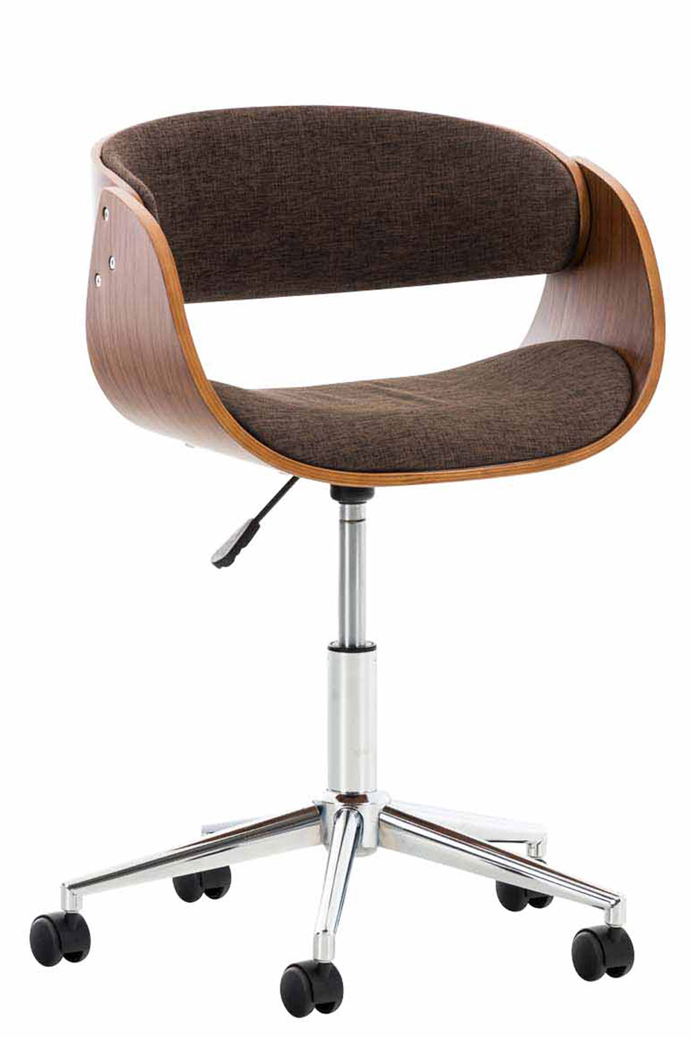 Der Bürosessel Portmore beeindruckt durch sein modernes Design und bietet dank der Rückenlehne hohen Komfort während des Arbeitens. Dieser exklusive Bürostuhl ist mit einer sehr hochwertigen Polsterung und Stoffbezug versehen. Der Holzrahmen aus Pappelholz ist mit einem Echtholzfurnier versehen und macht diesen Schreibtischstuhl zum absoluten Hingucker. Dank der stufenlos verstellbaren Sitzhöhe ist ergonomisches Sitzen garantiert. Das stabile Gestell ist aus Metall in Chromoptik und steht standsicher auf fünf Leichtlaufrollen. Egal ob Hart- oder Teppichböden - man kann immer leicht und locker über den Boden rollen.