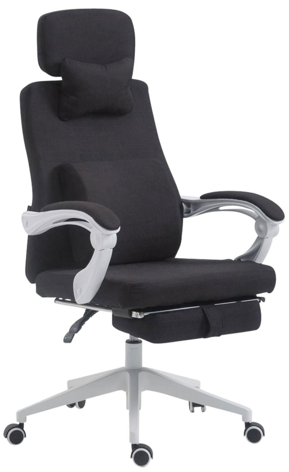 Bürostuhl Byron Stoff - Ein Klassiker mit Komfort! Mit dem Bürostuhl Byron ist Gemütlichkeit im klassischen Look angesagt. Eine hochwertige Polsterung, ein pflegeleichter Stoffbezug und stützende Polsterkissen sorgen für ein komfortables Sitzgefühl, welches auch bei längerem Verweilen bestehen bleibt. Die verstellbare Kopf-, Fußstütze und Rückenlehne sorgen zusätzlich für eine angenehme Pause zwischendurch, bei der sich entspannt zurückgelehnt werden darf und die Beine hochgelegt werden können. Dank der stufenlos verstellbaren Sitzhöhe und der gepolsterten Armlehnen garantiert der Bürostuhl Byron zudem jederzeit ein ergonomisches Sitzen. Dabei steht er standsicher auf fünf Leichtlaufrollen und einem Gestell aus Kunststoff. Egal ob Hart- oder Teppichböden - Sie werden immer leicht und locker über den Boden rollen können. Materialzusammensetzung: 100% Polyester Sitz: Bezug: Stoff Sitz, Arm- und Rückenlehne bequem gepolstert viele Farben zur Auswahl Gestell: Material: Kunststoff inklusive 5 Leichtlaufrollen Besonderheiten: Bürostuhl mit integrierter Fußstütze Höhenverstellbar durch Gasdruckfeder Drehbar Pflegehinweise: Keine Haushaltsreiniger verwenden Oberflächen nur mit geeignetem Aufsatz absaugen Für die Reinigung von Metalloberflächen genügt in der Regel eine milde Spüllösung