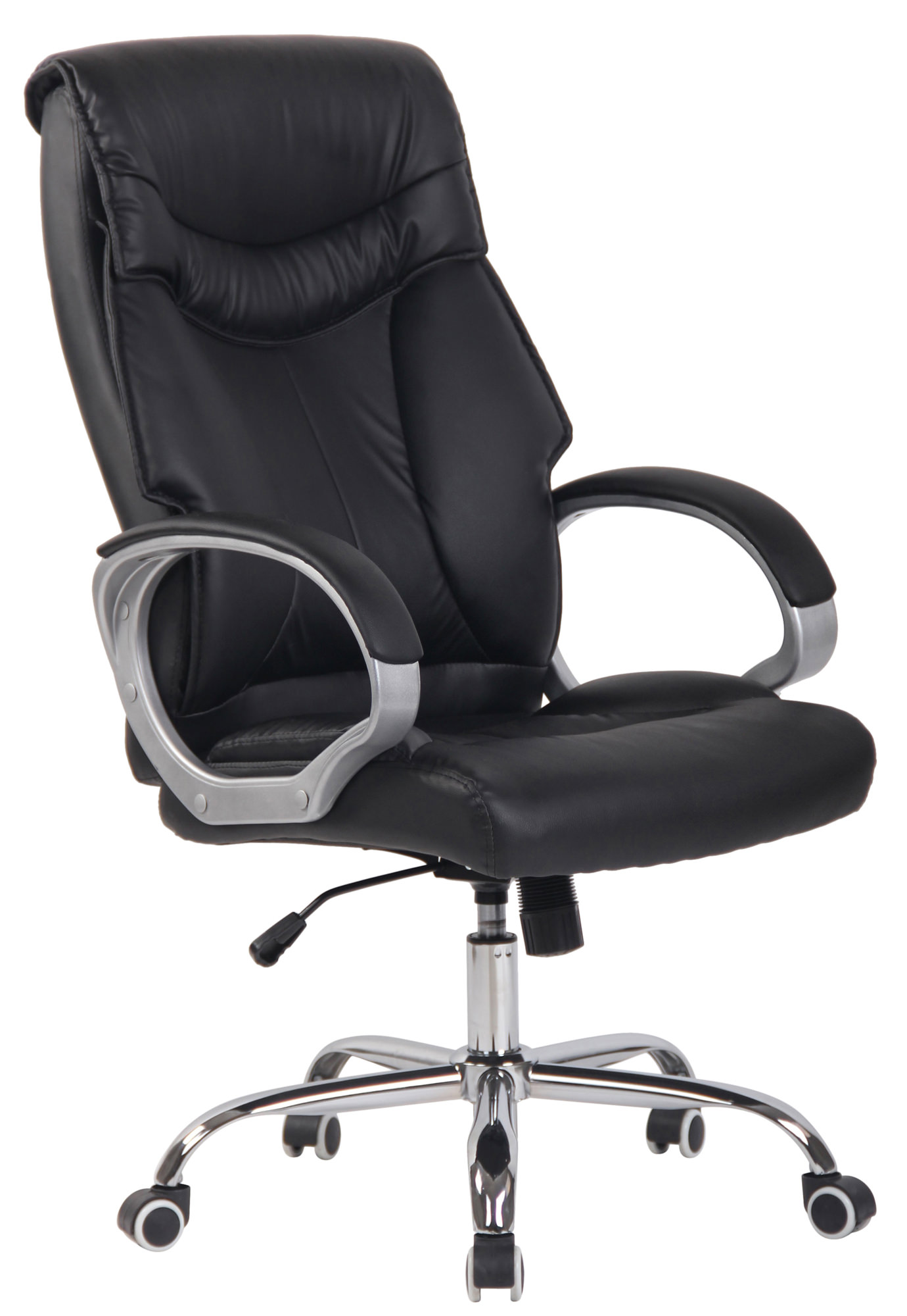 Bürostuhl Torro Der Chefsessel Torro ist ein extrem hochwertiger Bürostuhl mit einer sehr hochwertigen Polsterung und Kunstlederbezug. Kunstlederbezüge haben den Vorteil, dass sie elastisch sind und sich bei Entlastung wieder glatt ziehen. Dies sieht nicht nur schöner aus, sondern erhöht zusätzlich die Lebensdauer des Sitzbezuges. Kunstlederbezüge sind außerdem atmungsfähig, was grade bei hohen Temperaturen ein Vorteil ist. Das Gestell ist aus Metall in Chromoptik und sehr stabil. Die Sitzhöhe ist stufenlos verstellbar. Der Stuhl verfügt über einen eingebauten Wippmechanismus für mehr Bewegungsfreiheit. Der Bürostuhl verfügt über 5 sehr robuste Leichtlaufrollen. Egal ob Hart- oder Teppichböden - Sie werden immer leicht und locker über den Boden rollen können. Materialzusammensetzung: 100% Polyurethan Ca. Maße: Höhe: 118 - 128 cm Breite: 64 cm Tiefe: 65 cm Sitzhöhe: 47 - 57 cm Sitzfläche: 47 x 50 cm Rückenlehnenhöhe: 71 cm Höhe Armlehne (wenn Sitz heruntergefahren ist): 72 cm Armlehnebreite: 7,5 cm Polsterdicke: 8 cm Max. Belastbarkeit: 150 kg Sitz: Bezug: Kunstleder Sitz, Arm- und Rückenlehne angenehm gepolstert Gestell: Material: Metall Stabiles Fußkreuz mit fünf leichtgängigen Laufrollen Besonderheiten: Wippfunktion der Rückenlehne Stufenlos höhenverstellbar Stabile Konstruktion & strapazierfähiger Bezug Pflegehinweise: Leichte Verschmutzung mit feuchtem Baumwolltuch abwischen Zur Reinigung empfehlen wir ein mit lauwarmem Wasser angefeuchtetes Baumwolltuch Oberflächen nur mit geeignetem Aufsatz absaugen