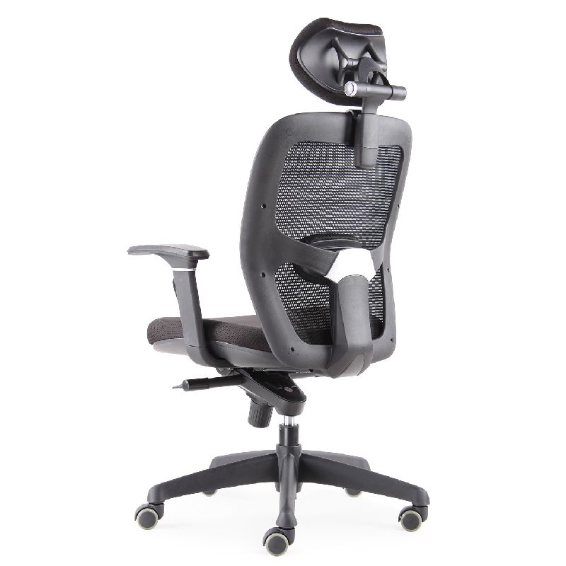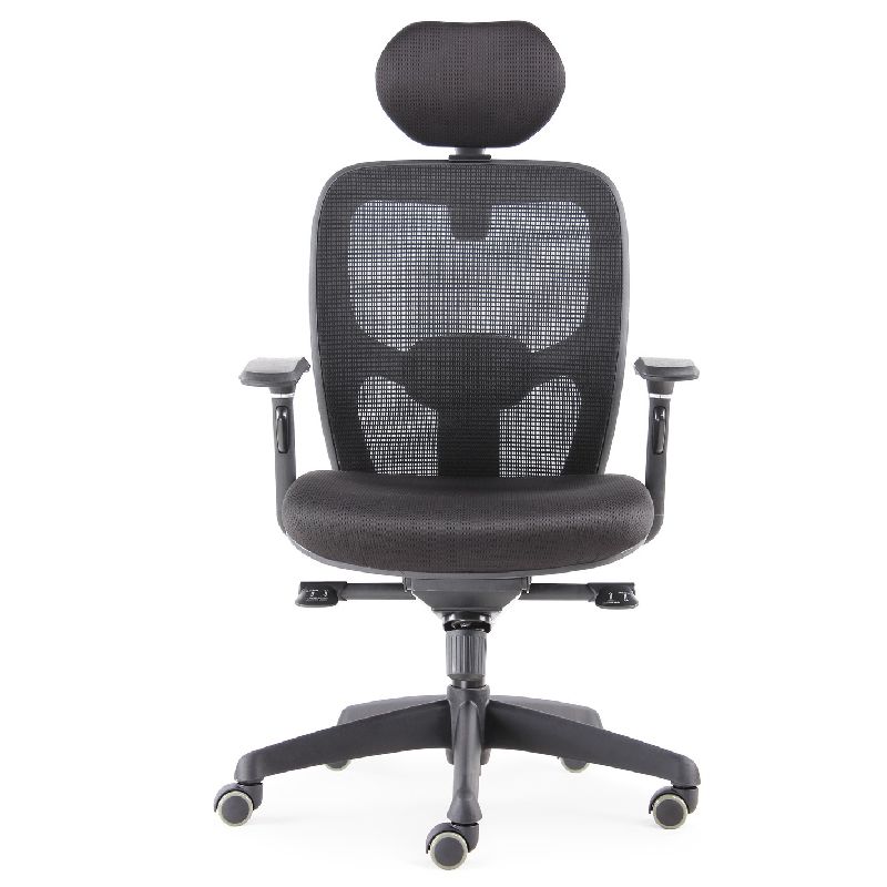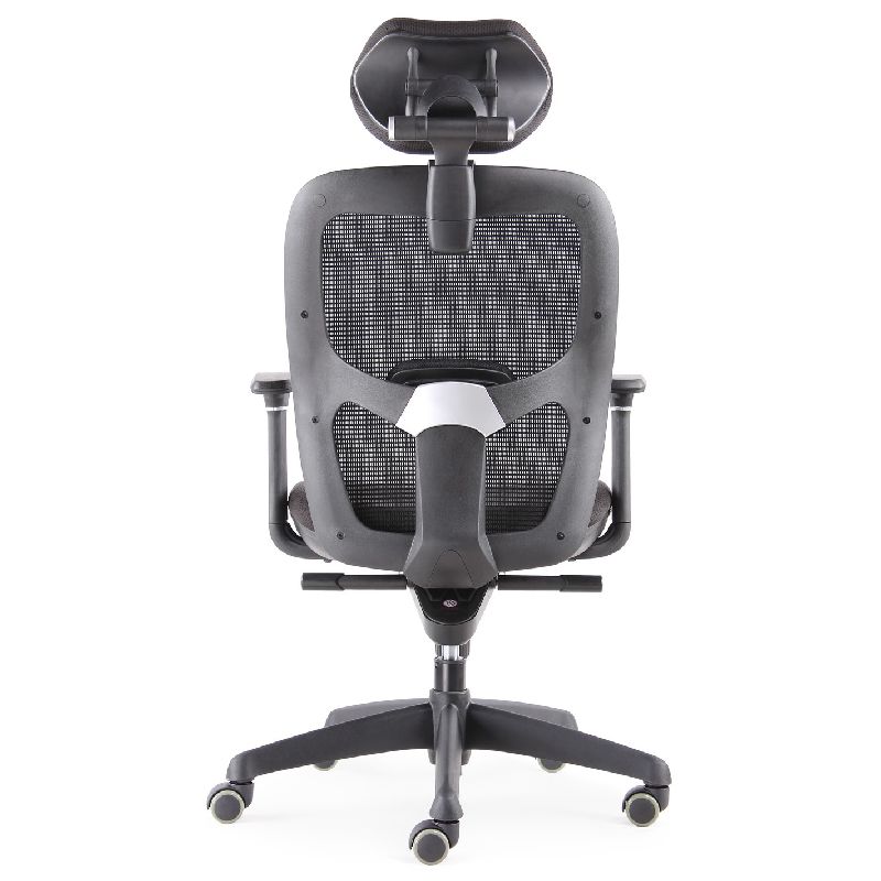 Silla de oficina Ergonómica con cabezal desmontable, sistema SINCRO, respaldo malla transpirable con apoyo lumbar y asiento de goma alta densidad con brazos regulables en altura, base piramidal con gran resistencia y durabilidad. Color NEGRO.