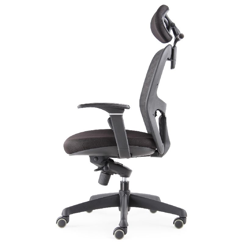 Su respaldo ergonómico de malla totalmente transpirable incluye apoyo lumbar regulable en profundidad y sus brazos son ajustables en altura.