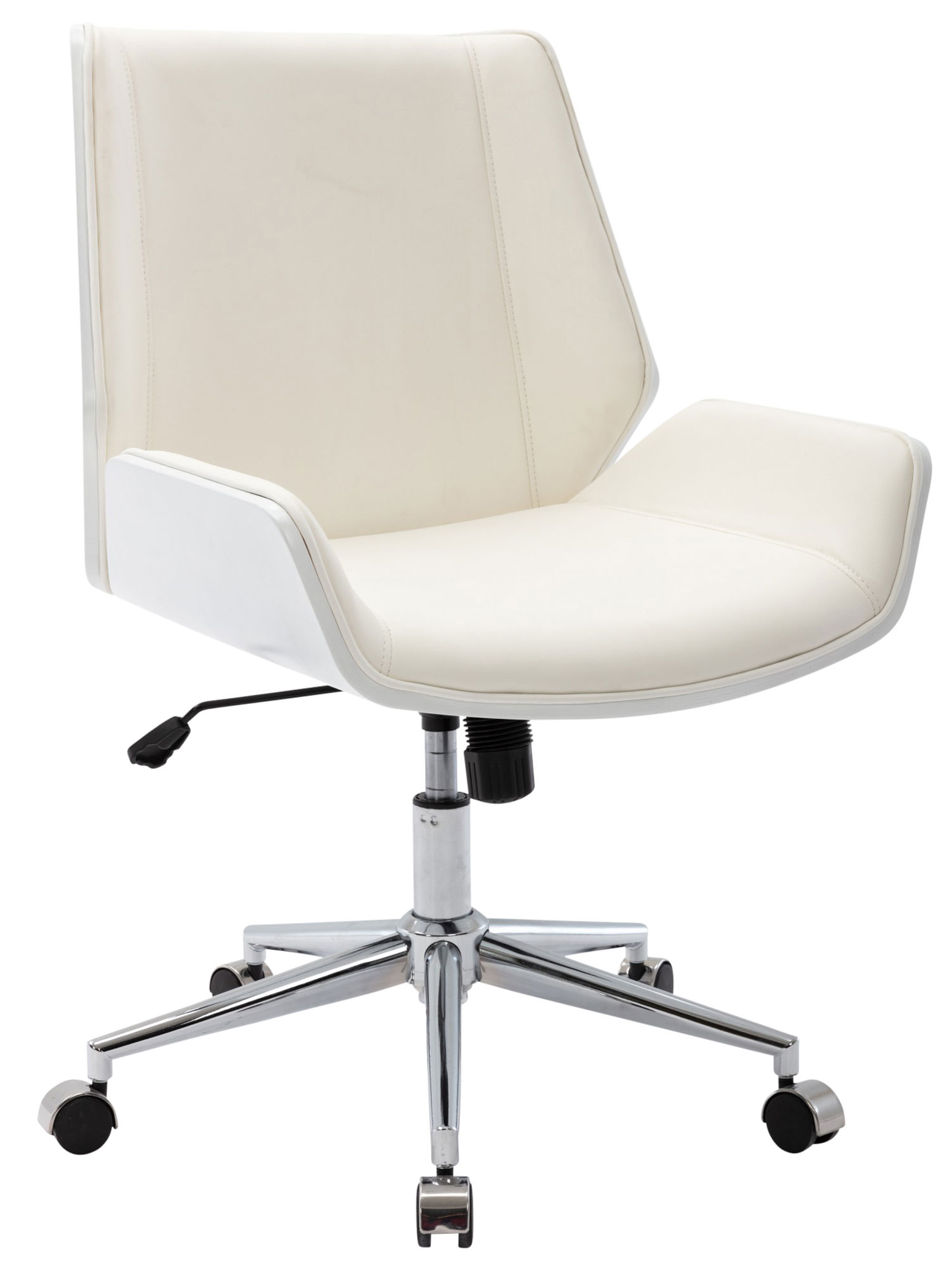 Bürostuhl Zwolle Dieser Bürostuhl hat eine sehr hochwertige Polsterung, die mit einem Kunstlederbezug versehen ist. Kunstlederbezüge haben den Vorteil, dass sie elastisch sind und sich bei Entlastung wieder glatt ziehen. Dies sieht nicht nur schöner aus, sondern erhöht zusätzlich die Lebensdauer des Sitzbezuges. Der Holzrahmen macht diesen Drehstuhl zum absoluten Hingucker und verleiht ihm ein edles Design. Dank der stufenlos verstellbaren Sitzhöhe ist ergonomisches Sitzen garantiert und der eingebaute Wippmechanismus sorgt für mehr Bewegungsfreiheit. Das Gestell ist aus Metall in Chromoptik und sehr stabil. Der Schreibtischstuhl steht standsicher auf fünf Leichtlaufrollen. Egal ob Hart- oder Teppichböden - man kann immer leicht und locker über den Boden rollen. Materialzusammensetzung: 100% Polyurethan Ca. Maße: Gesamthöhe: 88 - 96 cm Gesamtbreite: 60 cm Gesamttiefe: 65 cm Sitzhöhe: 44 - 52 cm Sitzfläche (BxT): 42 x 51 cm Höhe Rückenlehne: 45 cm Max. Belastbarkeit: 136 kg Gewicht: 15 kg Sitz: Bezug: Kunstleder Sitz und Rückenlehne bequem gepolstert Hohe Sitzqualität Gestell: Material: Metall Mit stabilem Drehkreuz 5 Leichtlaufrollen Besonderheiten: Stufenlos höhenverstellbar Wippfunktion für mehr Bewegungsfreiheit Stabile Konstruktion & strapazierfähiger Bezug Pflegehinweise: Leichte Verschmutzung mit feuchtem Baumwolltuch abwischen Zur Reinigung empfehlen wir ein mit lauwarmem Wasser angefeuchtetes Baumwolltuch Oberflächen nur mit geeignetem Aufsatz absaugen